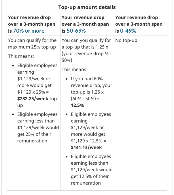 For employers who qualify, an additional top-up is available when the average revenue drop over the previous 3 months is equal to 50% or more. See the chart below, reproduced from the Government of Canada’ explanation of the CEWS changes: